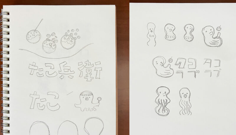 最初に2種類のたこ焼き屋さんのロゴデザインのラフを作成しました。スマホで撮影して画像ファイルをipadやパソコンに送付しています。